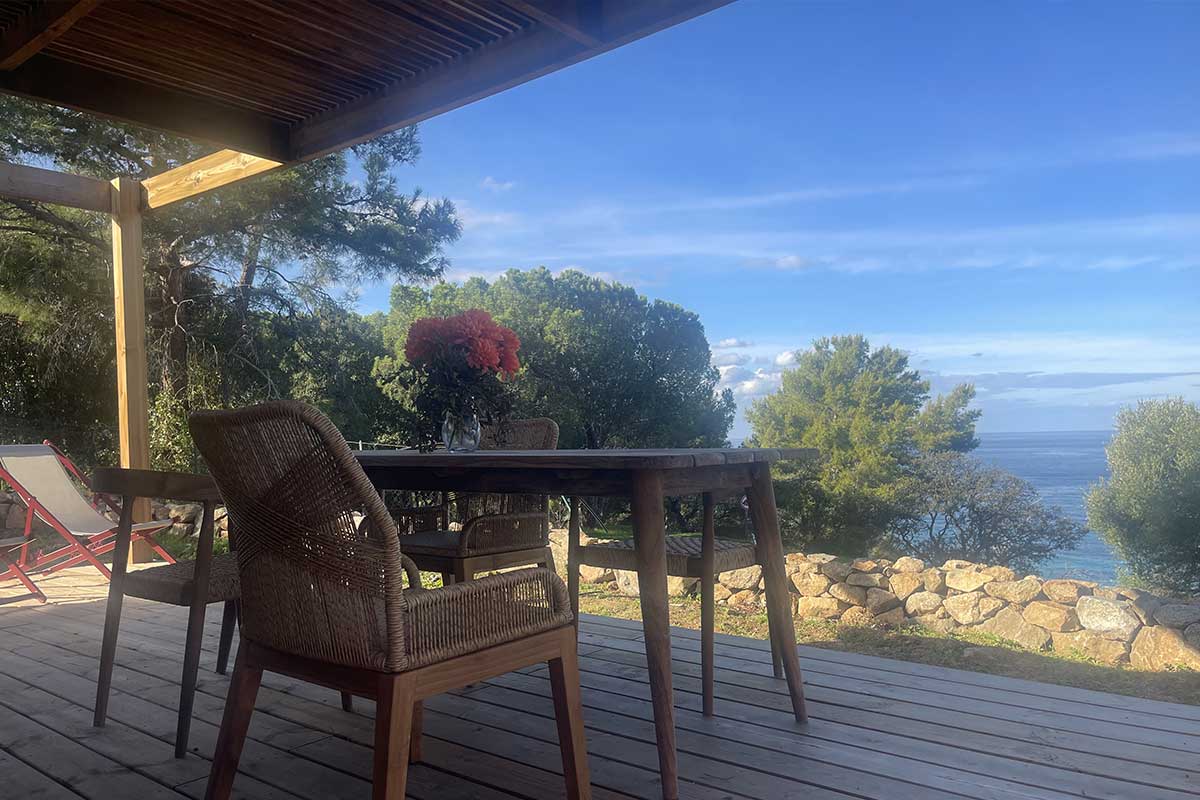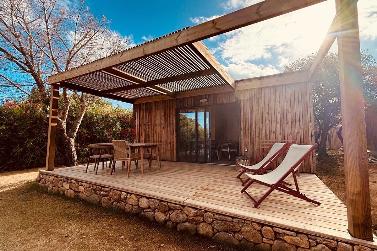 Le luxe authentique, sulpté par la nature corse. Un chalet en bois local dont il hérite son nom, élégant et intime, avec sa terrasse généreuse bordé par les pins et oliviers. Confort moderne, finitions naturelles: un refuge spacieux au embrun du maquis.